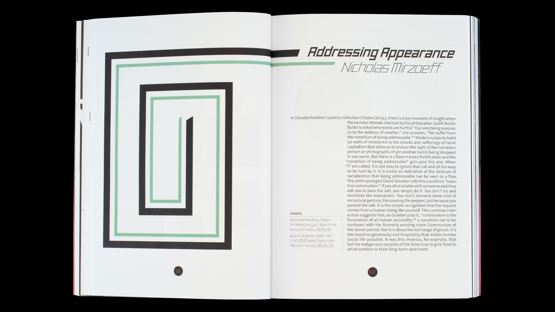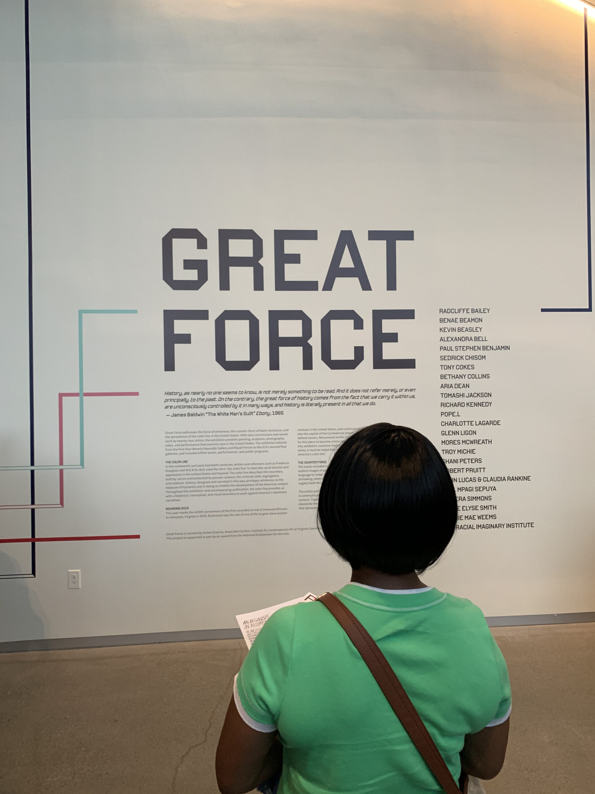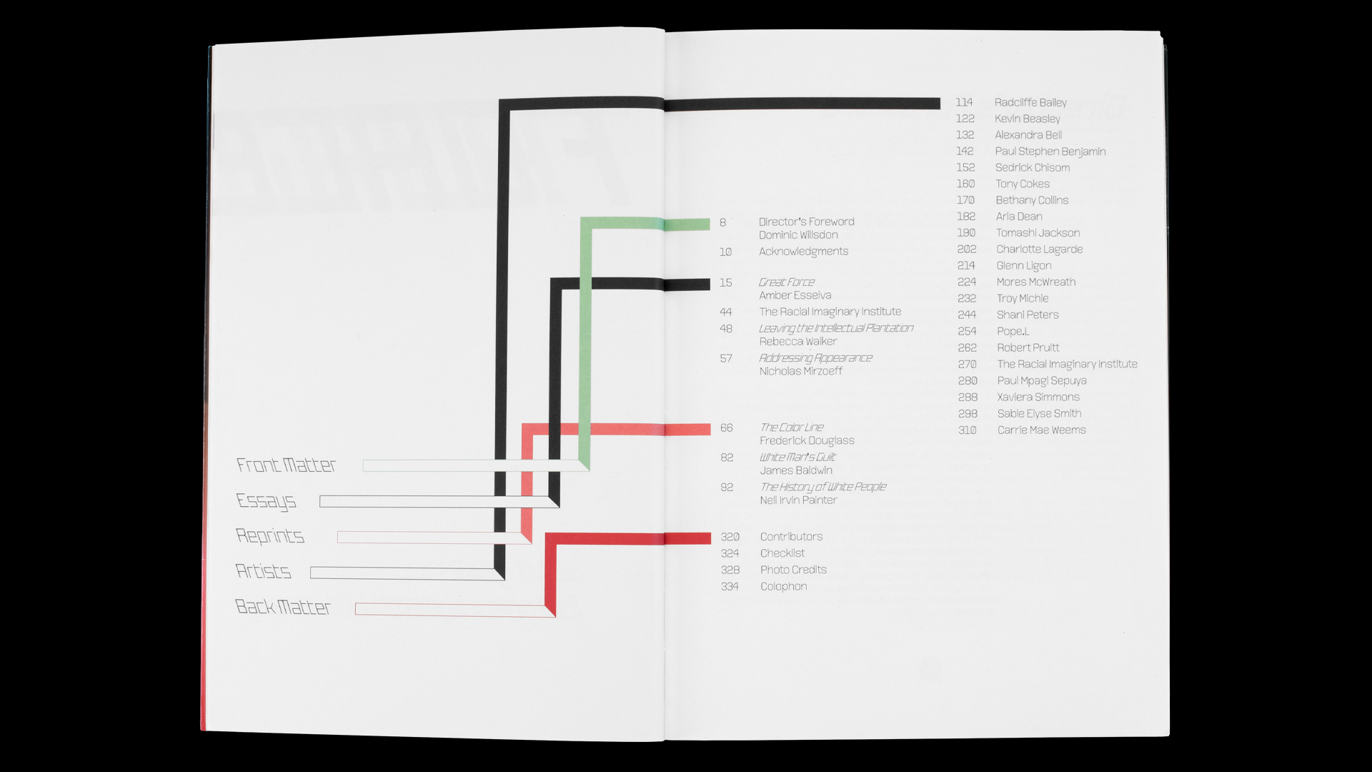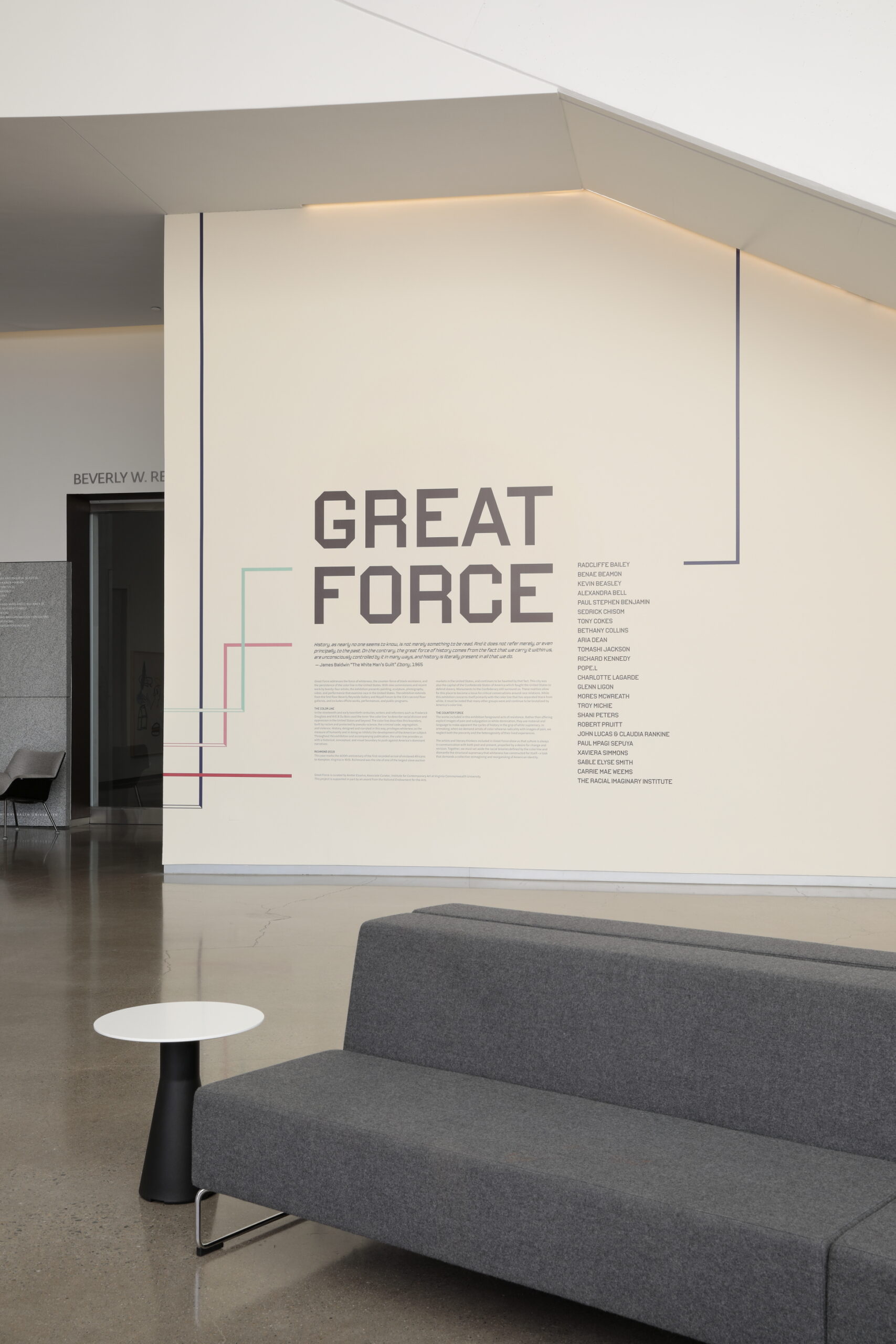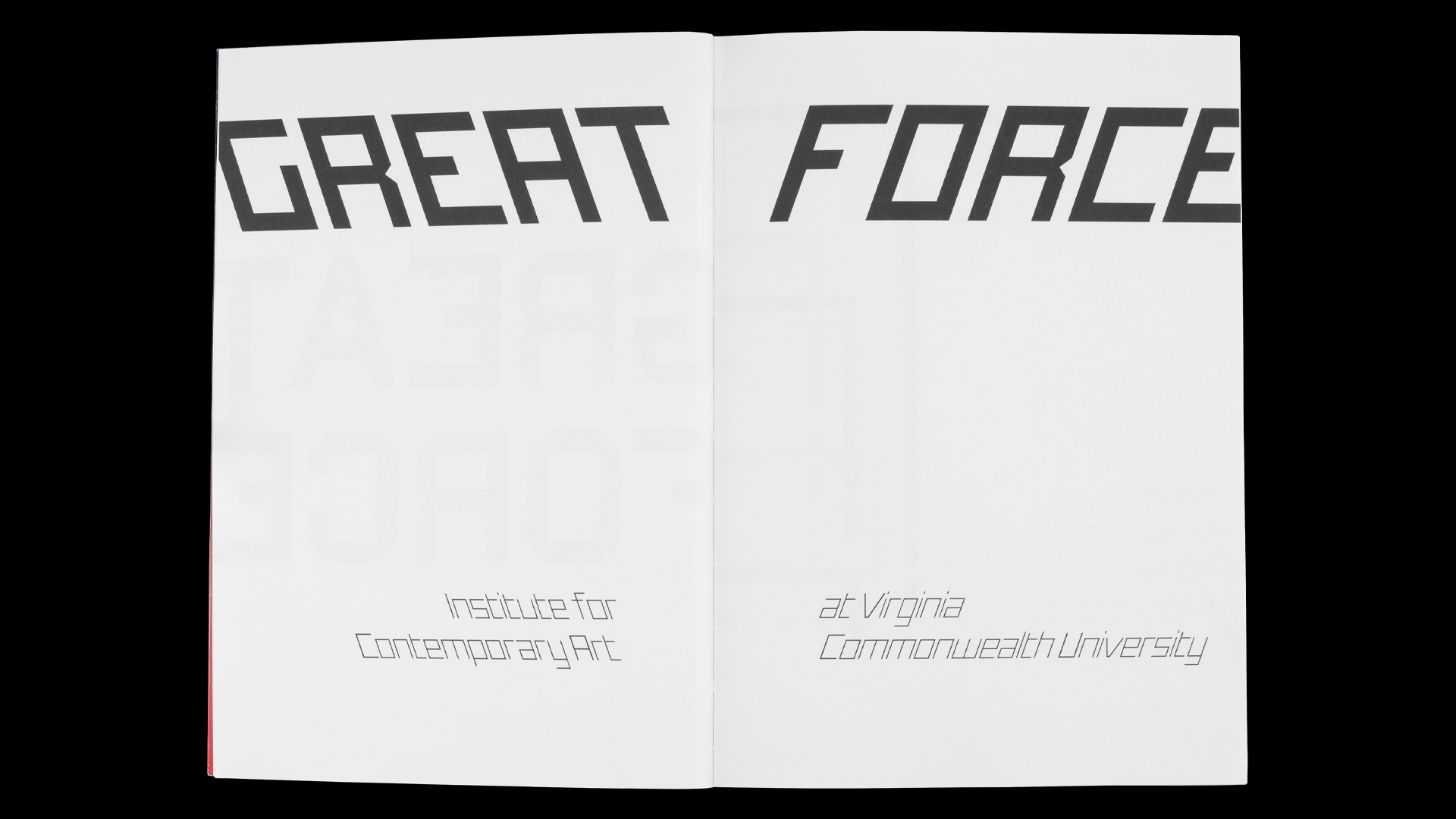 Great Force was group show of artists on view at Institute for Contemporary Art at Virginia Commonwealth University (ICA at VCU) confronting the impact of racism in America. Polymode designed the fully illustrated catalog that includes images and texts from the artists in the exhibition, new contributions from writers Nicholas Mirzoeff and Rebecca Walker, an essay by exhibition curator Amber Esseiva, historical reprints from Frederick Douglass, James Baldwin, and Nell Irvin Painter, and custom information design created by Polymode that informed the themes of the exhibition.