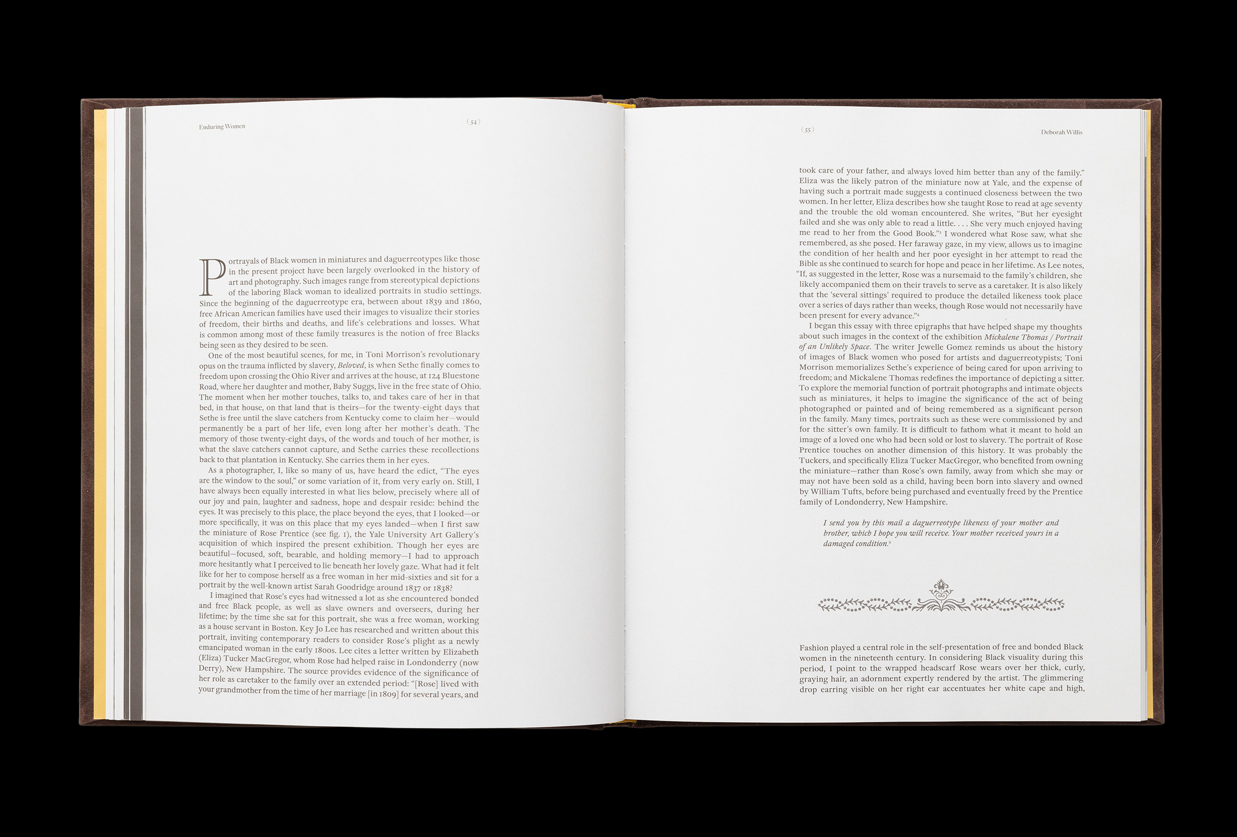 The New England Primer, a publication that taught school children to read in the early 18th century, was the basis for the book’s size. As people of color were enslaved and not formally educated, we added two inches to the margin to give space to those marginalized. Images and captions push into the dialogue, taking up space, showing the self-reliance and strength of the enslaved. The portraits themselves are backed with rich color to mimic a photo album.The publication utilizes a fifth color, Mickalene’s “espresso black.” The only white used is the ‘unlikely space’ on the title page. All other tones are a draw of that fifth plate. The work is typeset in William Text by Maria Doreuli.
