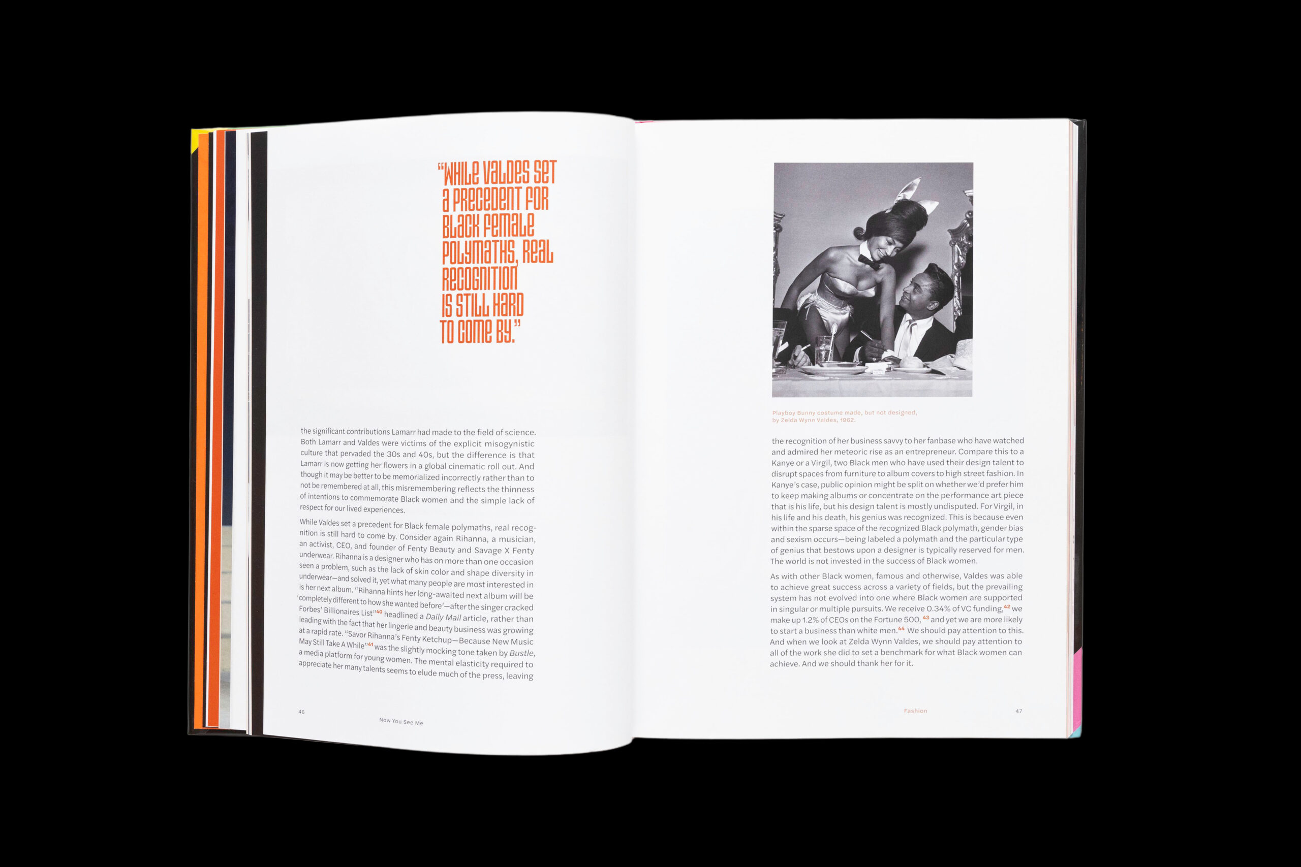 This ground-breaking book celebrates a century of work by black graphic artists, architects, and fashion designers whose art has helped define key cultural moments and movements. This vibrant and wide-ranging book, full of photographs and illustrations, aims to correct that oversight, bringing a century of Black designers and their work into focus. The book is organized into three sections focusing on Fashion, Architecture, and Graphic Design. Charlene Prempeh uses the pioneering work of key figures from the 20th and 21st centuries to explore important aspects of how Black design has been perceived within culture and society. The core design motif is representative of African fabric and cloth block colors, which are expressed boldly and vibrantly on the cover. These colors also help organize way-finding as someone flips through the pages but also draw attention to the vibrancy of Black life. To then uplift Black design excellence, the four typefaces chosen for the publication are also produced by Black designers. The title is set in Harlemecc by Jaamal Benjamin, nodding back to the Harlem Renaissance. The subheadlines and callouts are the faces: VTC Spike, VTC Tre, and The Neu Black all designed by Tré Seals; each containing and retelling an important aspect of Black history, the civil rights movement, aspects of Spike Lee’s career, and Tré’s storytelling approach to building a typeface. The body copy is set in Halyard designed by Joshua Darden Studios and acts as a thread across the sections to ground the history of Black Design.