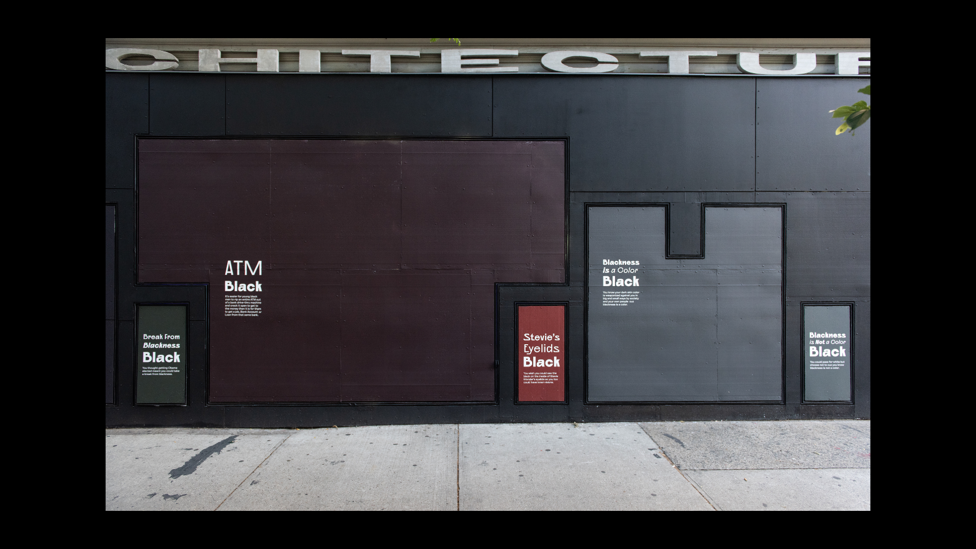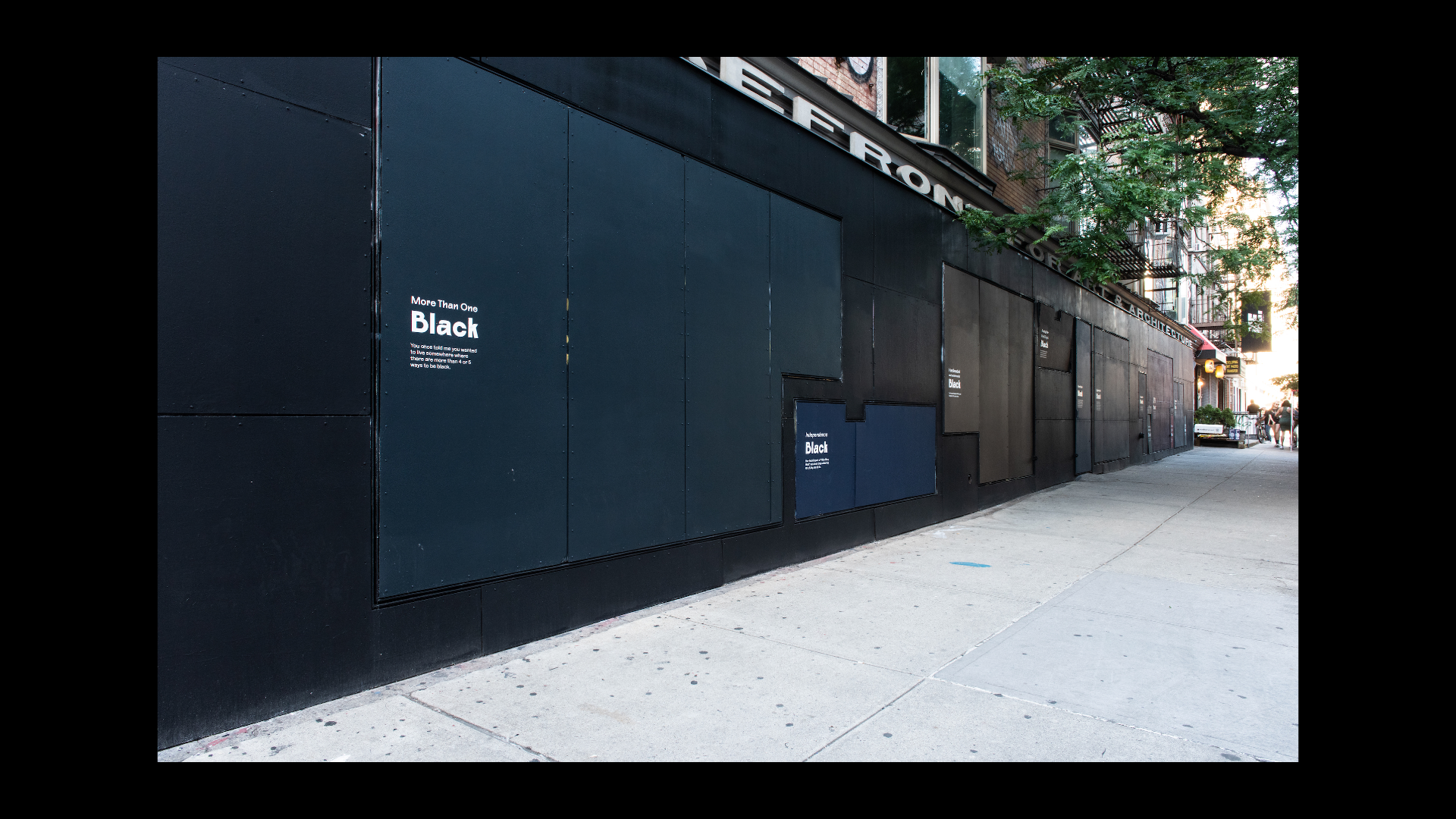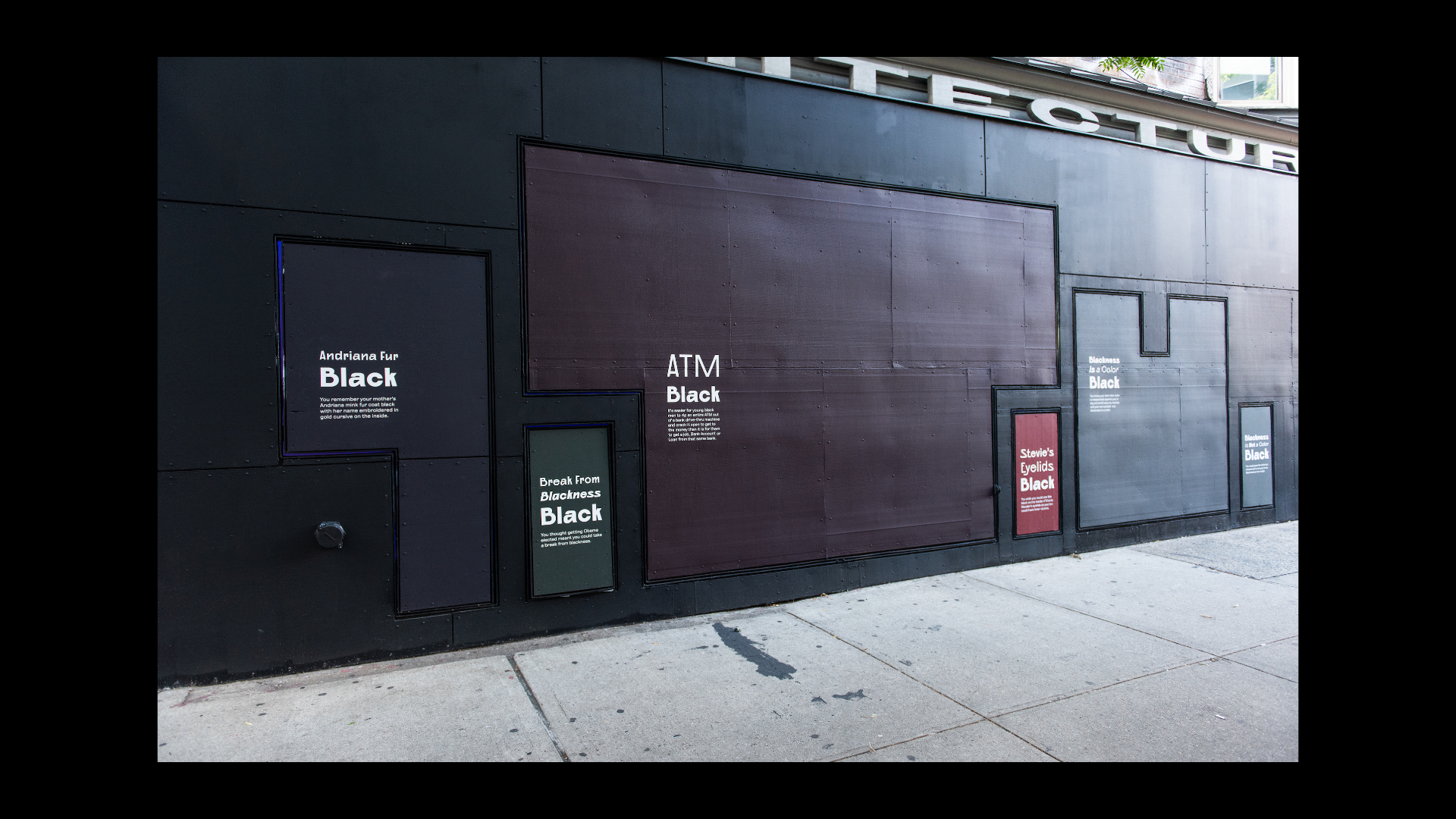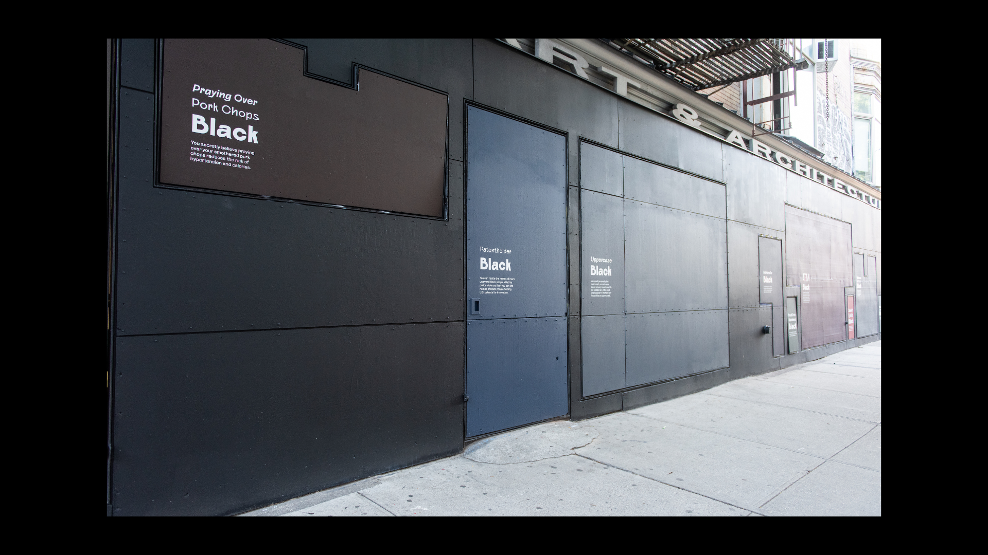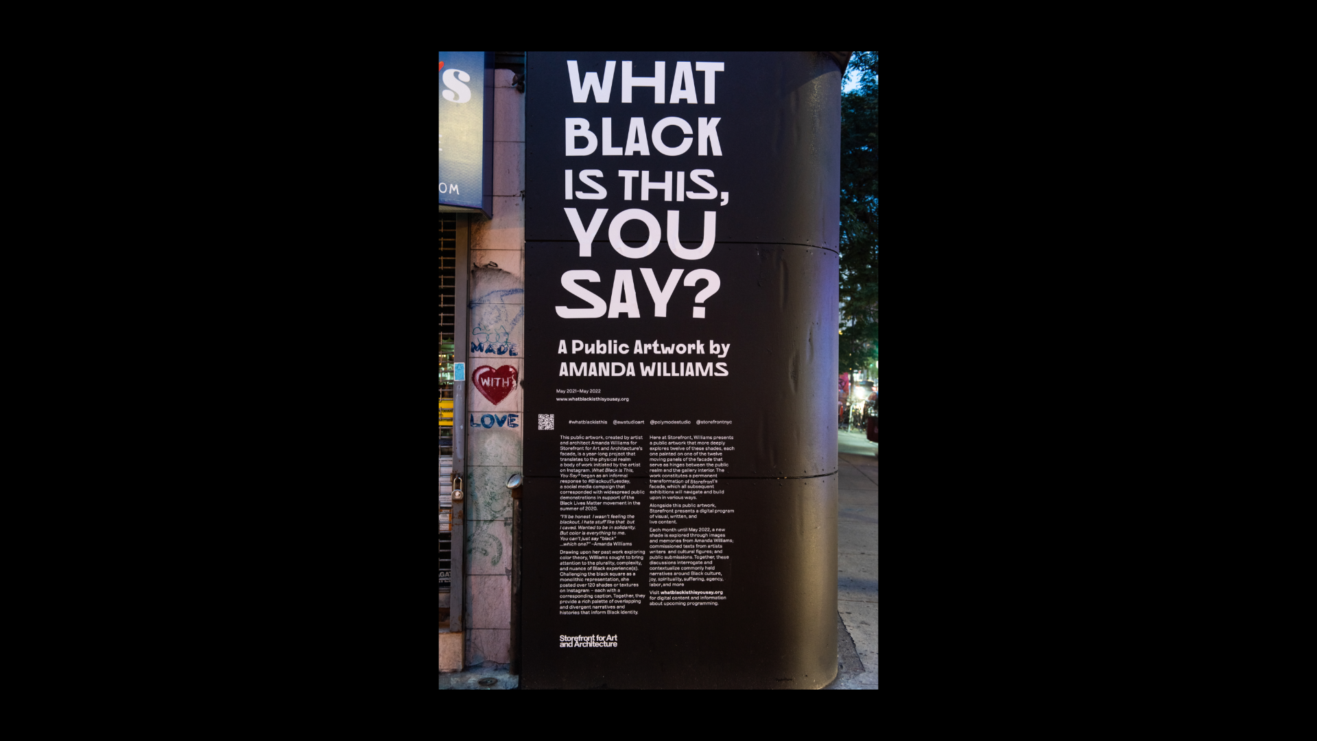 What Black Is This, You Say? is a public artwork created by Amanda Williams for the Storefront Art & Architecture facade. This project was in response to #blackouttuesday, a social media campaign to show solidarity for Black lives and calls for justice in response to George Floyd’s murder and the many lives lost before him. Williams explores color theory, specifically as it relates to the plurality, complexity, and multiplicity of Black experiences. The facade showcases a wide range of Black(ness) through color and its corresponding caption; a juxtaposition to the monolithic representation on social media. Polymode designed the typographic treatments that accompany the painted shades of Black to act in conjunction with one another; honoring the color and the intimate experience of walking up to the work. The typographic forms showcase a range of realness both in italic and bold versions of Polymode Sans, a custom typeface designed in collaboration with XYZ Type Foundry that express various tones while remaining neutral.