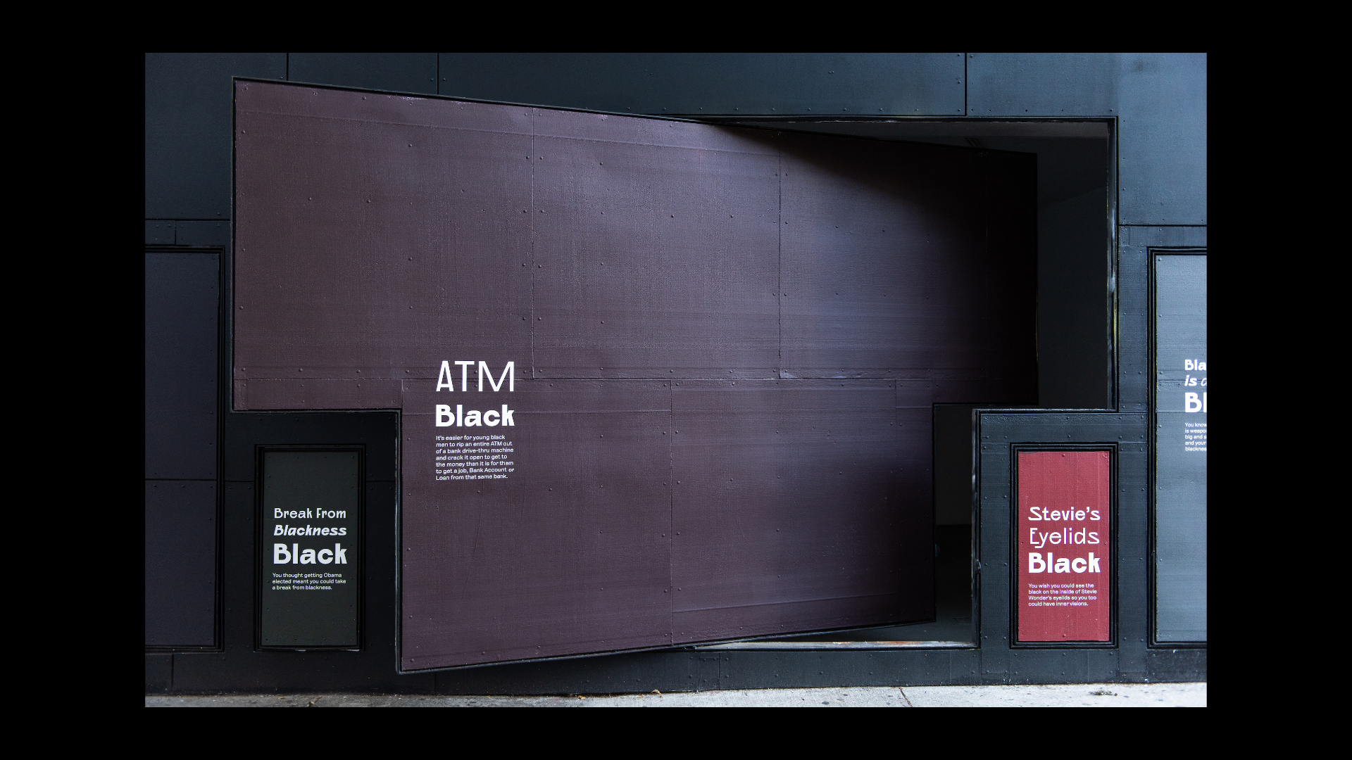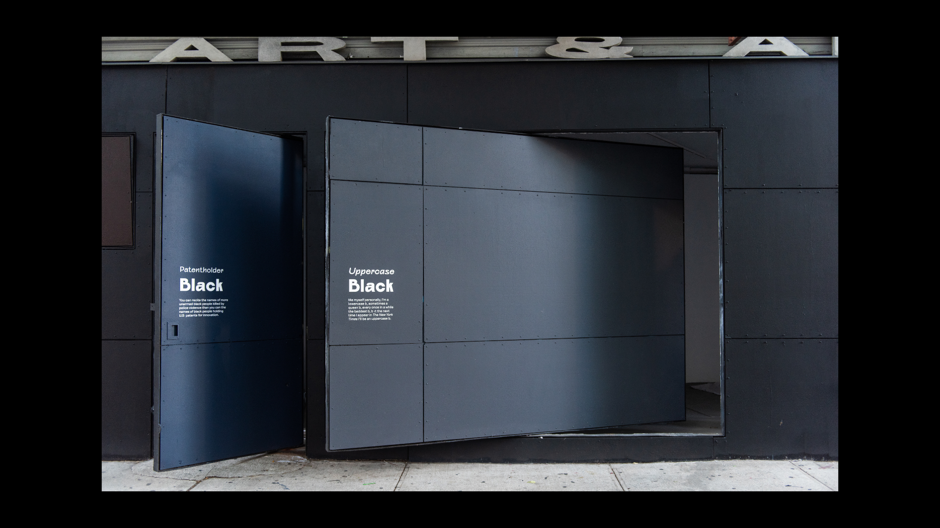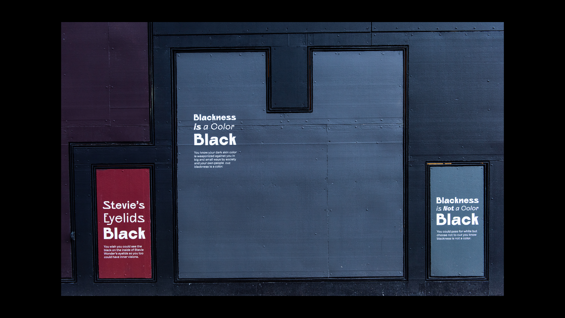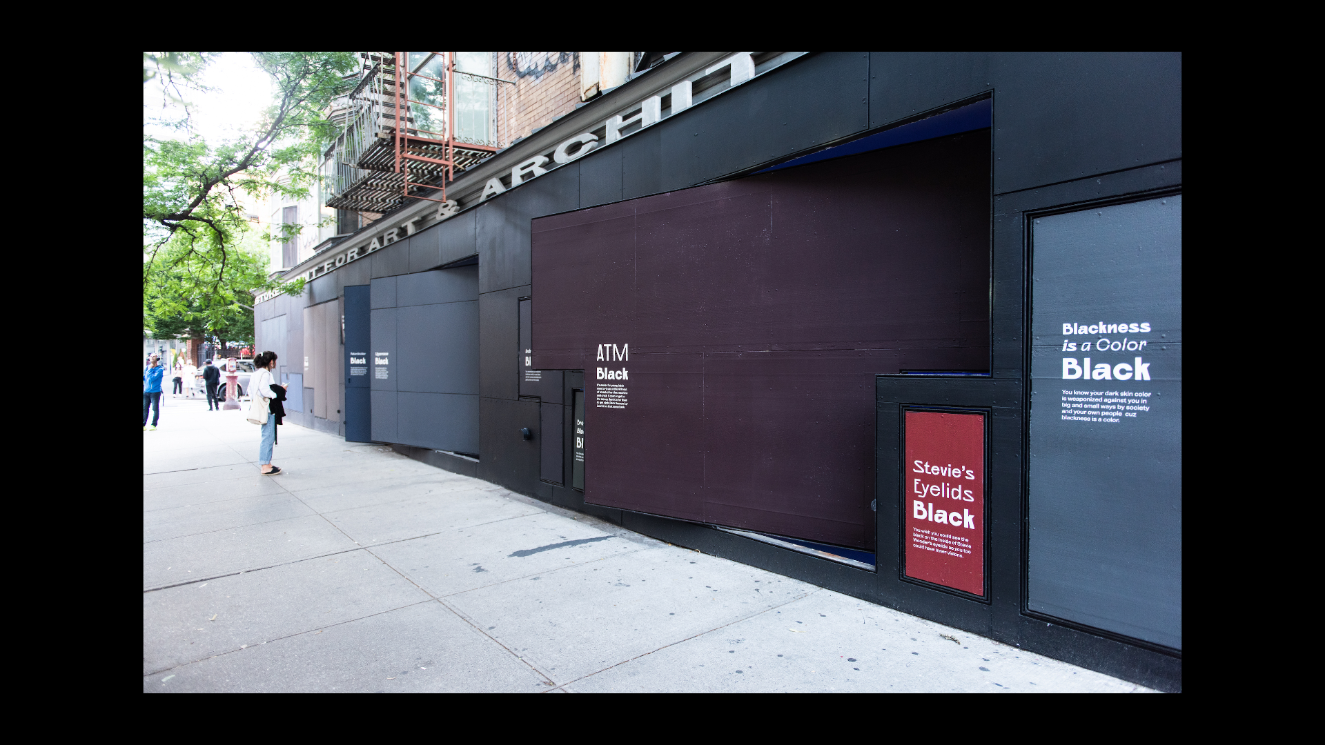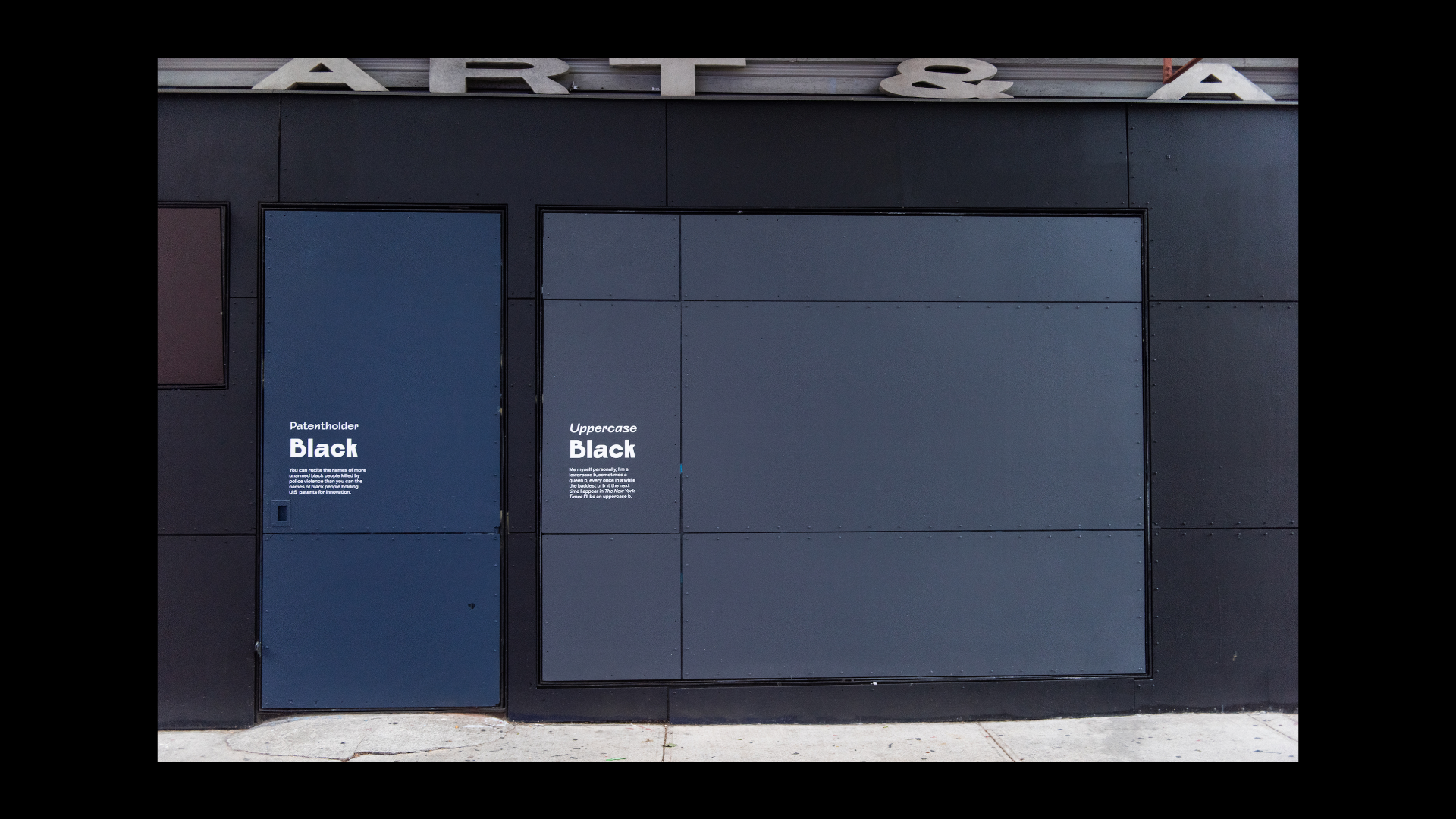 What Black Is This, You Say? is a public artwork created by Amanda Williams for the Storefront Art & Architecture facade. This project was in response to #blackouttuesday, a social media campaign to show solidarity for Black lives and calls for justice in response to George Floyd’s murder and the many lives lost before him. Williams explores color theory, specifically as it relates to the plurality, complexity, and multiplicity of Black experiences. The facade showcases a wide range of Black(ness) through color and its corresponding caption; a juxtaposition to the monolithic representation on social media. Polymode designed the typographic treatments that accompany the painted shades of Black to act in conjunction with one another; honoring the color and the intimate experience of walking up to the work. The typographic forms showcase a range of realness both in italic and bold versions of Polymode Sans, a custom typeface designed in collaboration with XYZ Type Foundry that express various tones while remaining neutral.