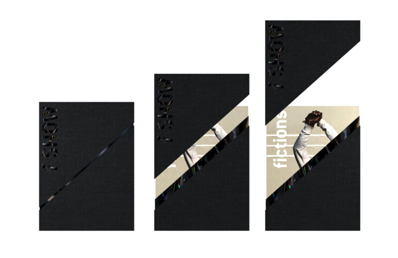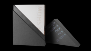 The sculptural and sleek forms of the box echo the materials and cantilevered aesthetics of the new architectural home for The Studio Museum designed by David Adjaye and Associates. The display typography, ITC conduit, set by the f SHOW brand takes on a new permanence foil stamped in a black iridescent finish. The box is accompanied by a printed pamphlet with a new introduction by Thelma Golden, an artist list from all shows, and matching iridescent foil-stamping.