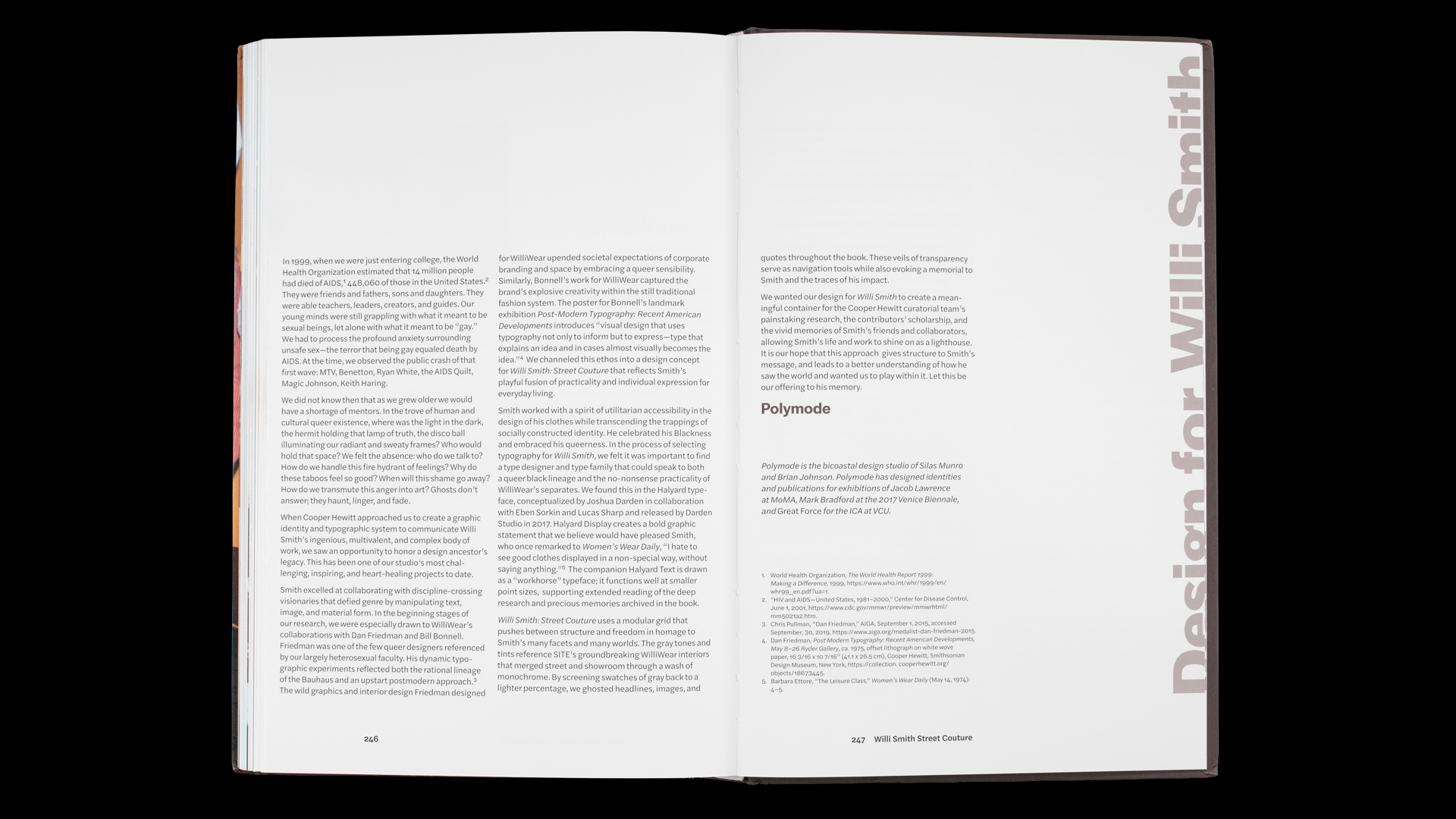 Conceptually, the identity of the exhibition comprises a set of fundamental elements: verticality; Smith’s cutting-edge designs; the ghosting of memory and the collective loss of potential mentors to AIDS (as expressed by the grey tones); New York’s architecture and broad avenues; and the proportions of the standing, human body. This theme flows seamlessly through all forms of the identity’s typography—from the catalog’s front matter, to the headlines displayed throughout the galleries, and other related exhibition content.